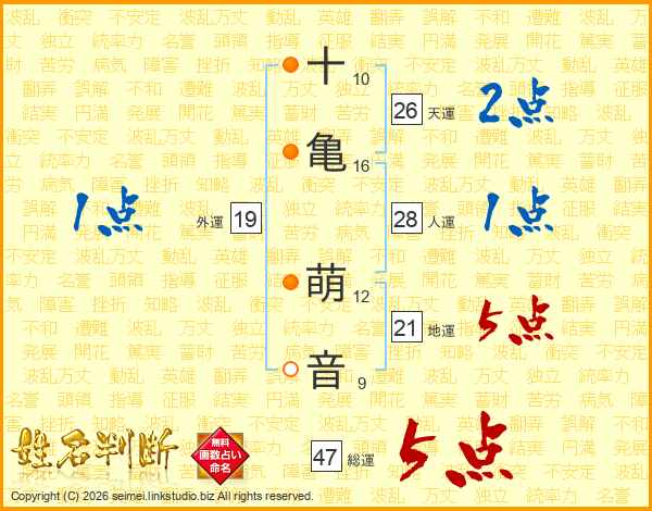 十亀萌音さんの地運は21画の5点!