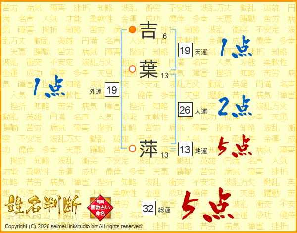 吉(6画)葉(13画) 萍(13画)