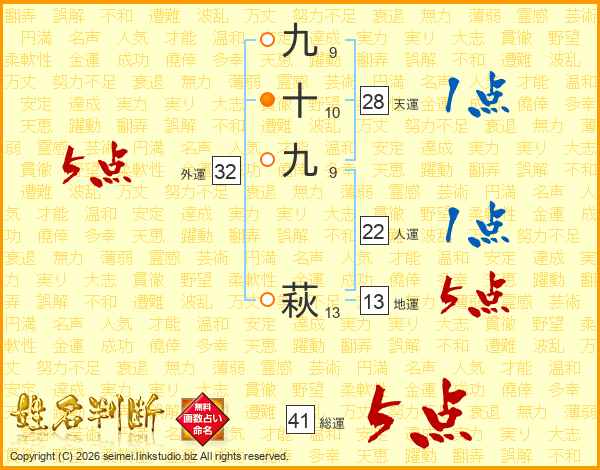 九十九萩さんの総運は41画の5点!