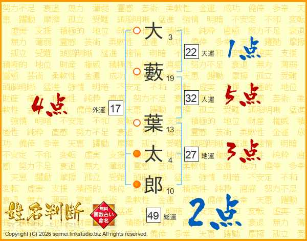 大(3画)藪(19画) 葉(13画)太(4画)郎(10画)