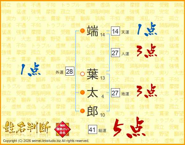 端葉太郎さんの総運は41画の5点!