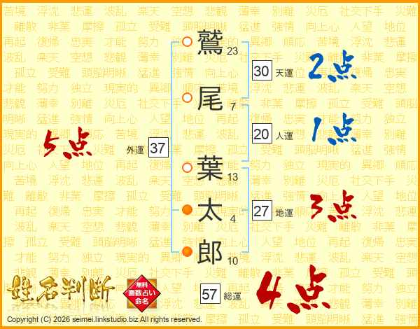 鷲(23画)尾(7画) 葉(13画)太(4画)郎(10画)