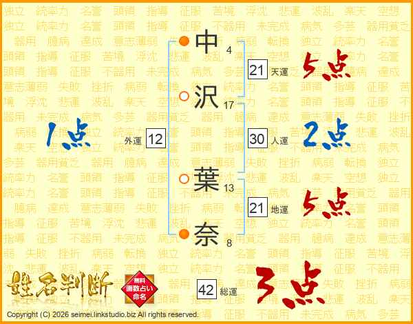 中(4画)沢(17画) 葉(13画)奈(8画)