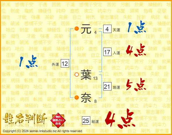 元(4画) 葉(13画)奈(8画)