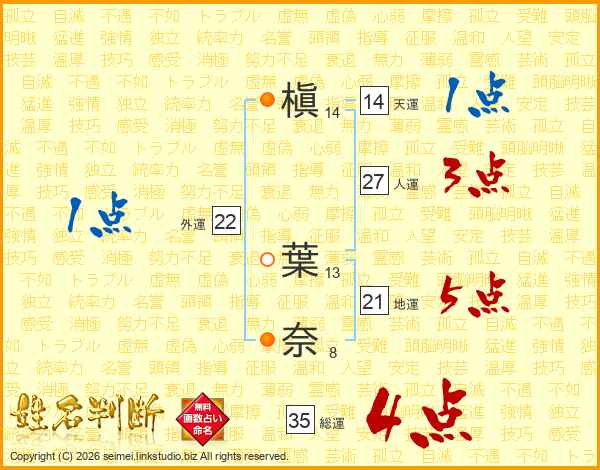 槇葉奈さんの総運は35画の4点!
