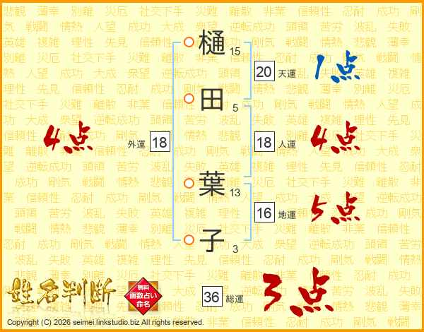 生活面を象徴する運勢です。外部から受ける影響力を表し、結婚運、家庭運や職場、環境への順応性を表します。総運から人運を引いた画数。姓や名が1文字の場合を除く。