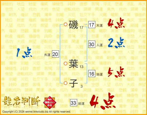 生活面を象徴する運勢です。外部から受ける影響力を表し、結婚運、家庭運や職場、環境への順応性を表します。総運から人運を引いた画数。姓や名が1文字の場合を除く。