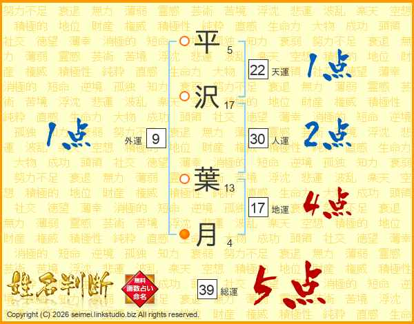 平(5画)沢(17画) 葉(13画)月(4画)