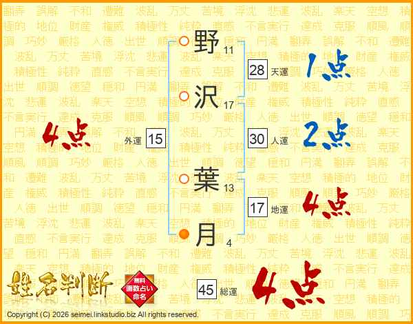 野(11画)沢(17画) 葉(13画)月(4画)