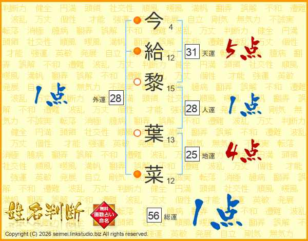 今(4画)給(12画)黎(15画) 葉(13画)菜(12画)