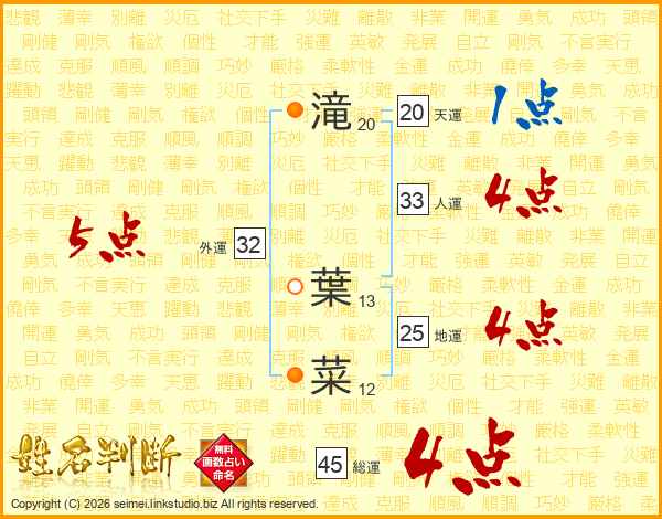 生活面を象徴する運勢です。外部から受ける影響力を表し、結婚運、家庭運や職場、環境への順応性を表します。総運から人運を引いた画数。姓や名が1文字の場合を除く。