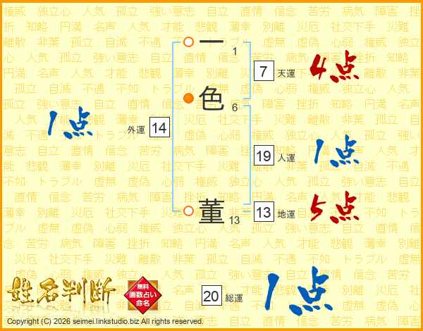 生活面を象徴する運勢です。外部から受ける影響力を表し、結婚運、家庭運や職場、環境への順応性を表します。総運から人運を引いた画数。姓や名が1文字の場合を除く。