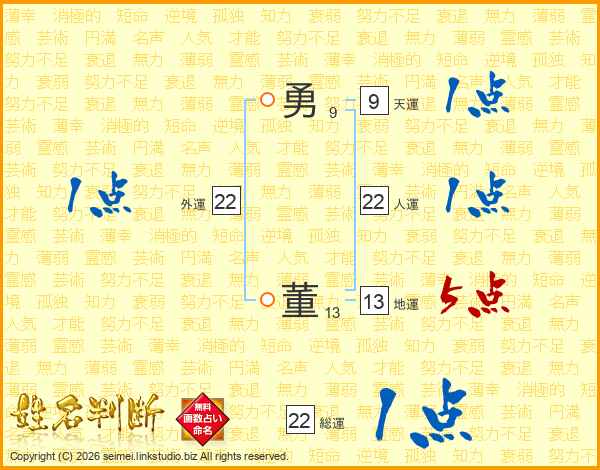 生活面を象徴する運勢です。外部から受ける影響力を表し、結婚運、家庭運や職場、環境への順応性を表します。総運から人運を引いた画数。姓や名が1文字の場合を除く。