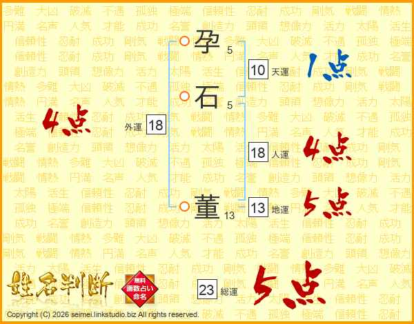 あなたの人生を表す1番重要な運勢です。生涯を通じて影響する総合運となり、主に50歳以降の晩年期に影響を及ぼします。苗字と名前の合計画数。