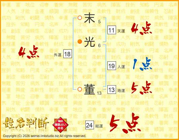 あなたの人生を表す1番重要な運勢です。生涯を通じて影響する総合運となり、主に50歳以降の晩年期に影響を及ぼします。苗字と名前の合計画数。