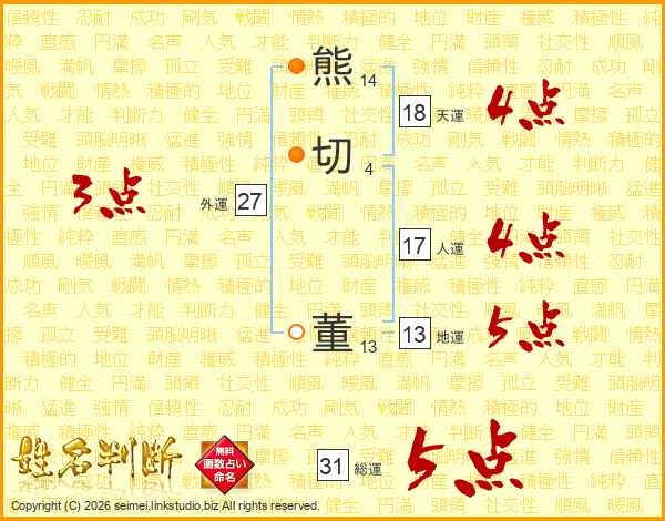家系が持つ宿命的な運勢を表します。祖先から受け継いだ苗字ですので自分の力が及びません。家柄を象徴します。苗字の合計画数。