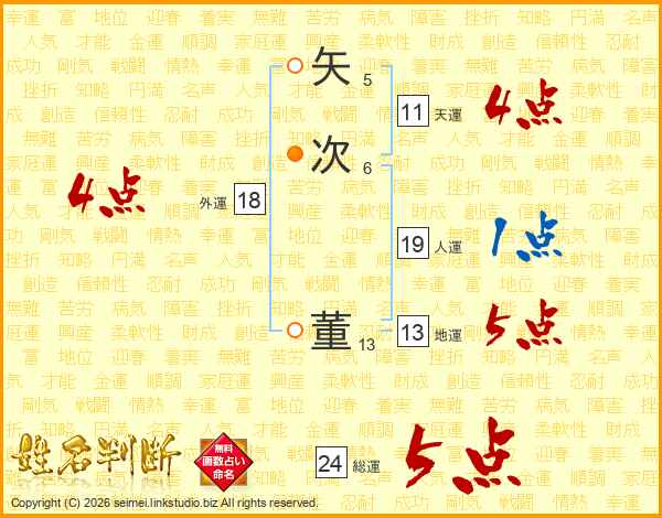 家系が持つ宿命的な運勢を表します。祖先から受け継いだ苗字ですので自分の力が及びません。家柄を象徴します。苗字の合計画数。