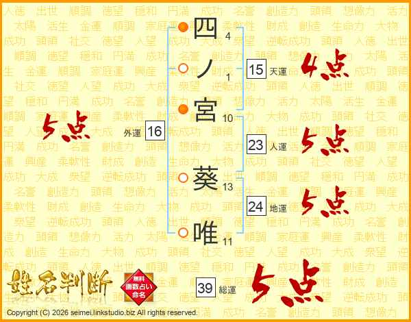 四(4画)ノ(1画)宮(10画) 葵(13画)唯(11画)