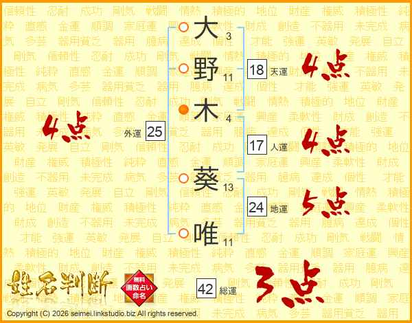 大(3画)野(11画)木(4画) 葵(13画)唯(11画)