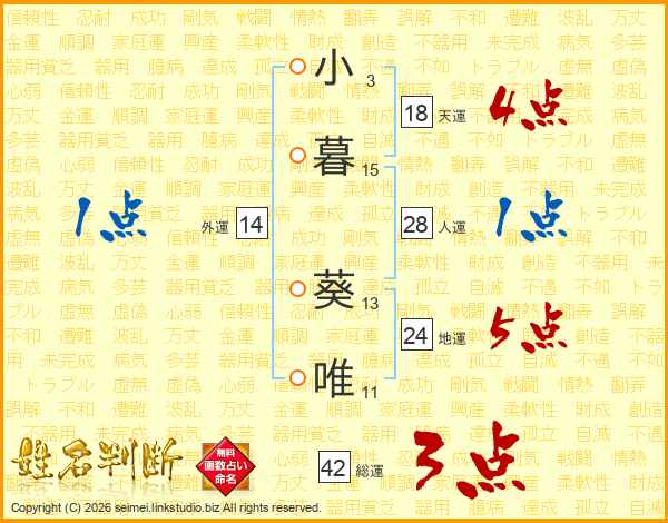 小暮葵唯さんの総運は42画の3点!
