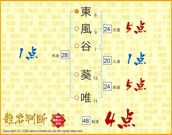 東(8画)風(9画)谷(7画) 葵(13画)唯(11画)