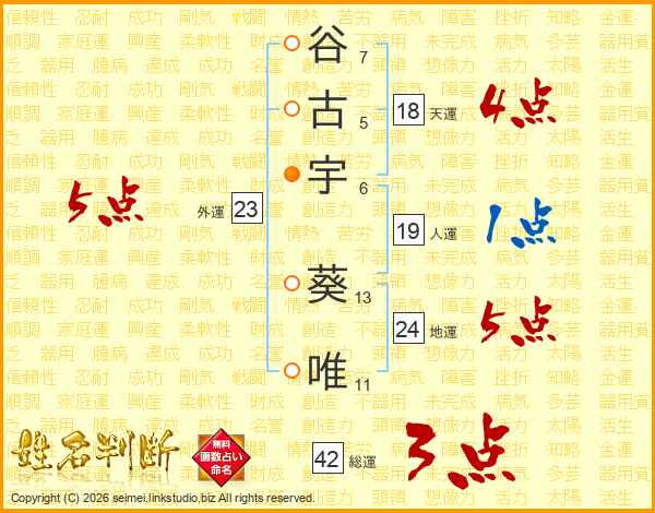 谷古宇葵唯さんの外運は23画の5点!