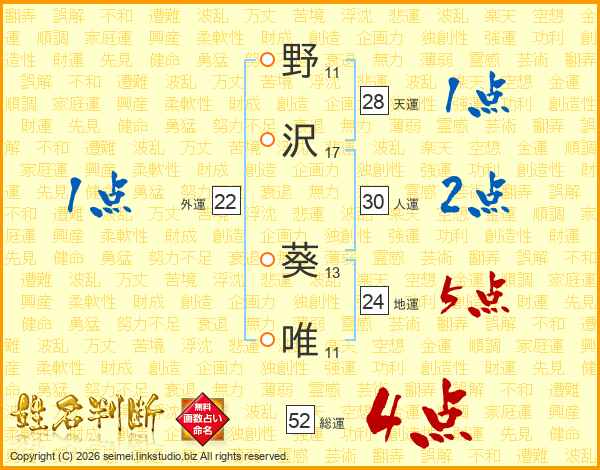 野(11画)沢(17画) 葵(13画)唯(11画)
