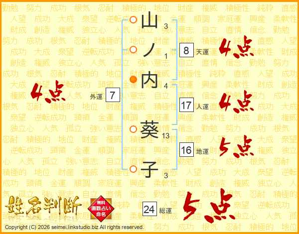 山(3画)ノ(1画)内(4画) 葵(13画)子(3画)