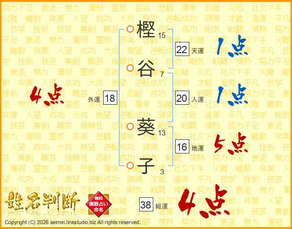 樫谷葵子さんの総運は38画の4点!