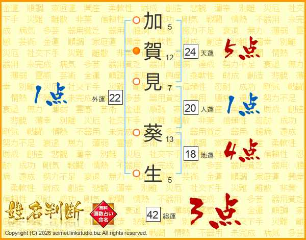 加(5画)賀(12画)見(7画) 葵(13画)生(5画)