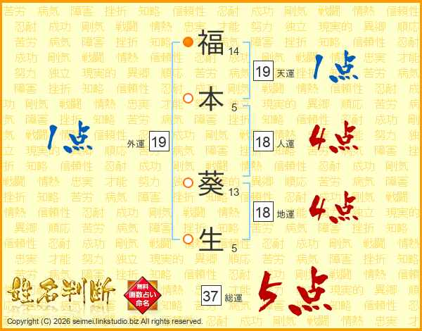 福(14画)本(5画) 葵(13画)生(5画)