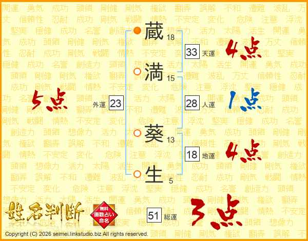 蔵(18画)満(15画) 葵(13画)生(5画)