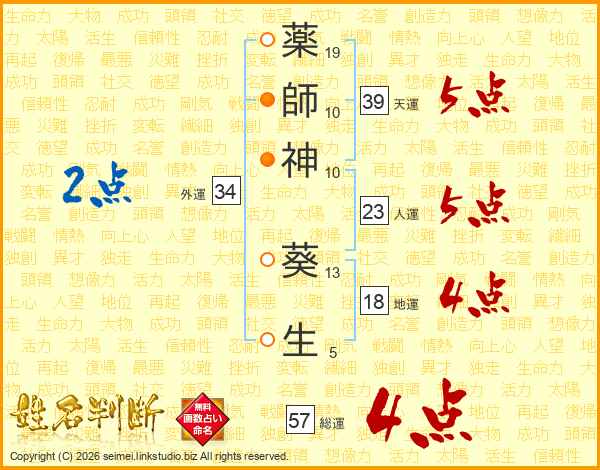薬(19画)師(10画)神(10画) 葵(13画)生(5画)