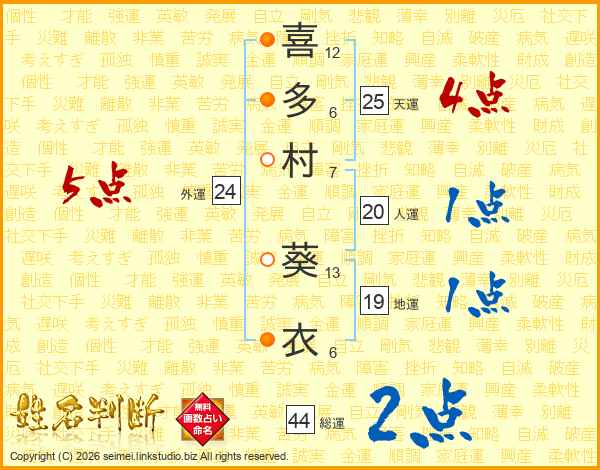 喜(12画)多(6画)村(7画) 葵(13画)衣(6画)