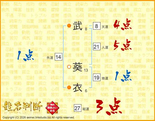 武(8画) 葵(13画)衣(6画)
