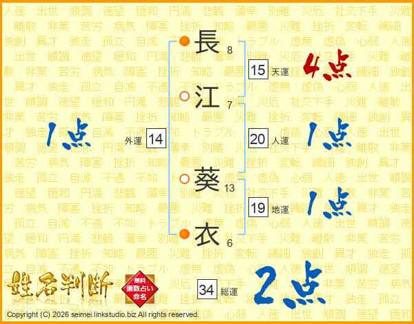 あなたの人生を表す1番重要な運勢です。生涯を通じて影響する総合運となり、主に50歳以降の晩年期に影響を及ぼします。苗字と名前の合計画数。