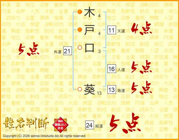 生活面を象徴する運勢です。外部から受ける影響力を表し、結婚運、家庭運や職場、環境への順応性を表します。総運から人運を引いた画数。姓や名が1文字の場合を除く。