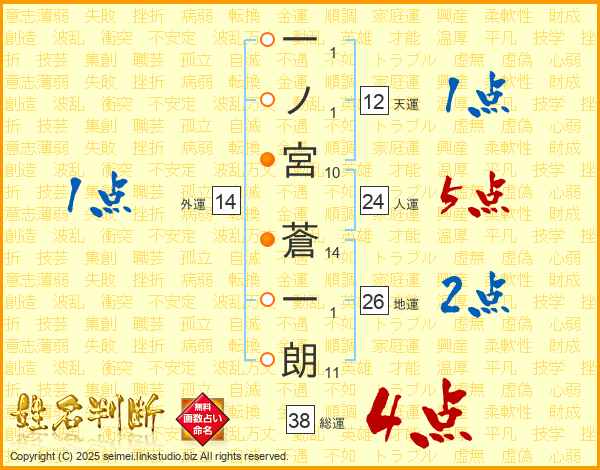 一ノ宮蒼一朗さんの総運は38画の4点!