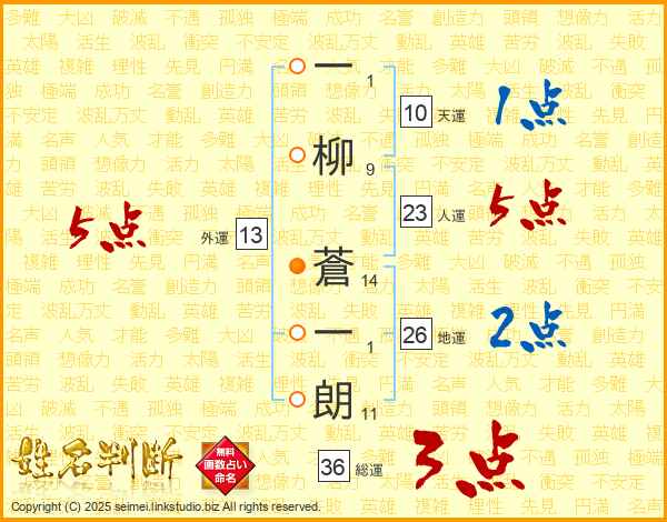一(1画)柳(9画) 蒼(14画)一(1画)朗(11画)