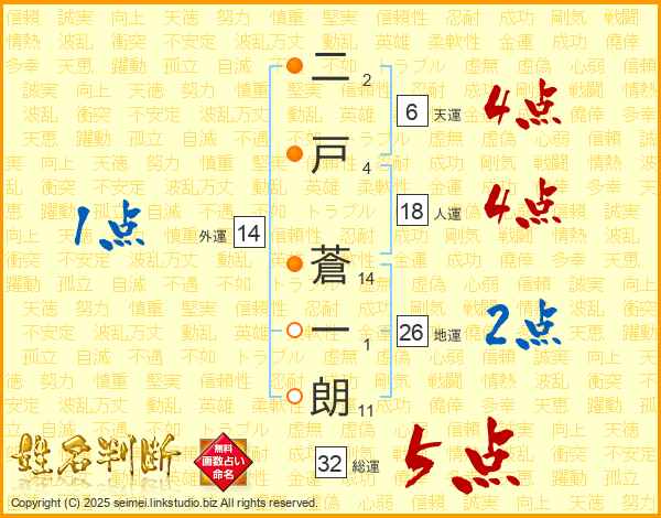 二(2画)戸(4画) 蒼(14画)一(1画)朗(11画)