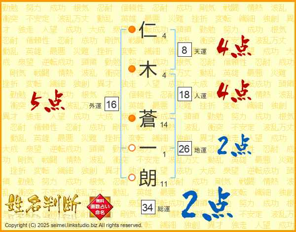 仁(4画)木(4画) 蒼(14画)一(1画)朗(11画)