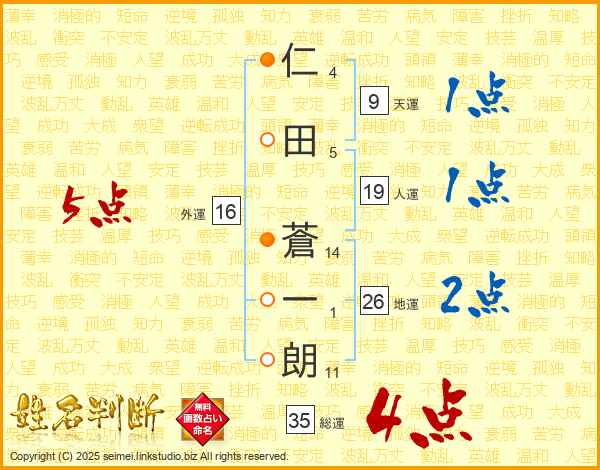 仁(4画)田(5画) 蒼(14画)一(1画)朗(11画)