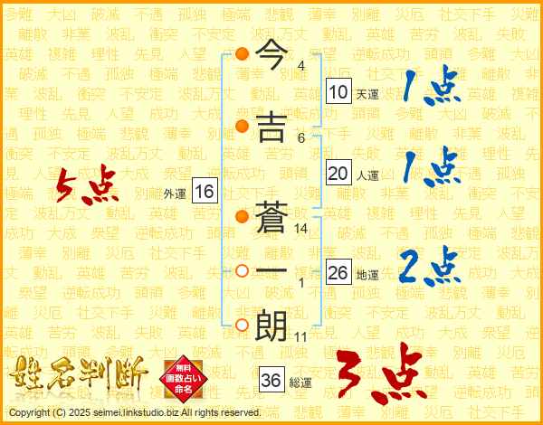 今(4画)吉(6画) 蒼(14画)一(1画)朗(11画)