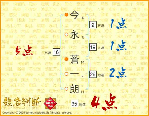 今(4画)永(5画) 蒼(14画)一(1画)朗(11画)