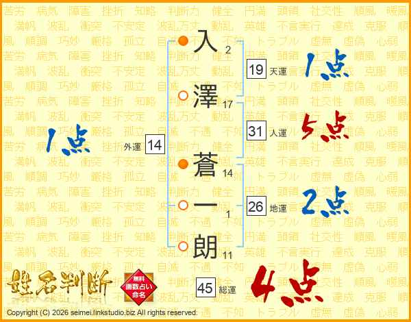 入(2画)澤(17画) 蒼(14画)一(1画)朗(11画)