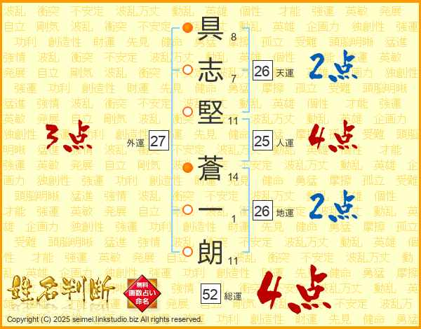 具(8画)志(7画)堅(11画) 蒼(14画)一(1画)朗(11画)