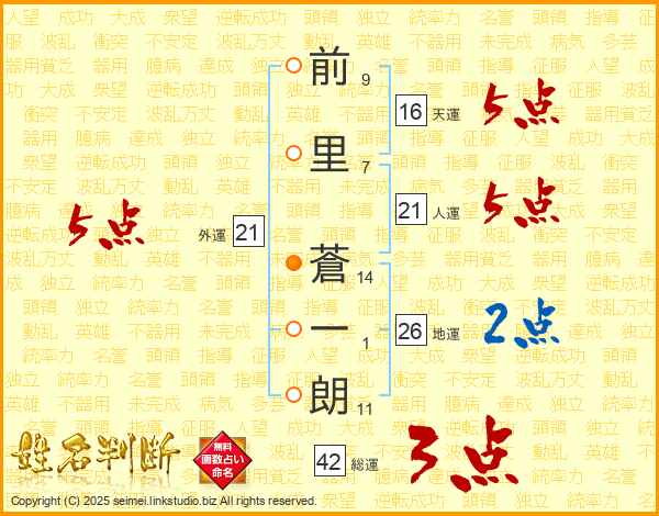 前(9画)里(7画) 蒼(14画)一(1画)朗(11画)