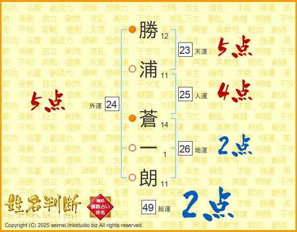 勝(12画)浦(11画) 蒼(14画)一(1画)朗(11画)
