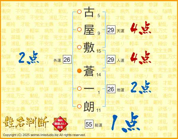 古(5画)屋(9画)敷(15画) 蒼(14画)一(1画)朗(11画)