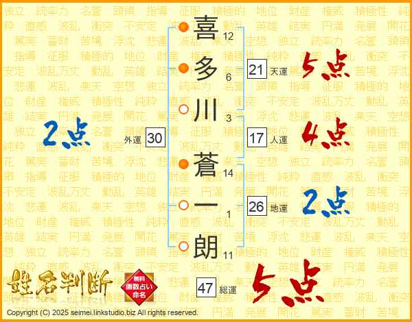 喜(12画)多(6画)川(3画) 蒼(14画)一(1画)朗(11画)